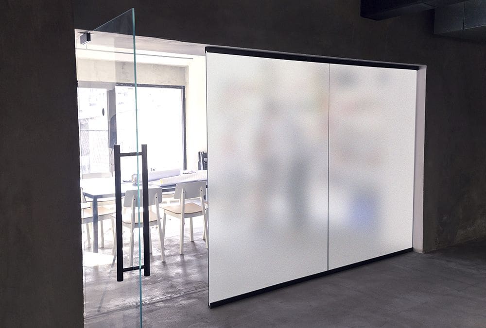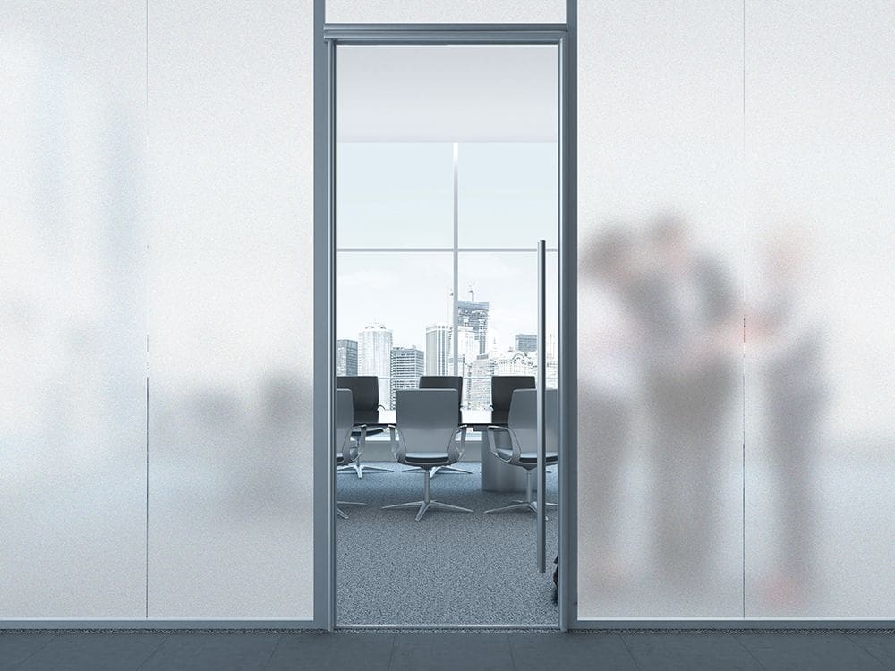 SX-1326 Daze is a white, frosted embossed film that simulates sandblasted glass. Made of durable polymeric vinyl, it is supplied with a silicone-coated liner which protects the clear, pressure-sensitive adhesive. This film is designed for application to interior glass, single- or double-pane, and is ideal for privacy, decorative, or architectural applications.