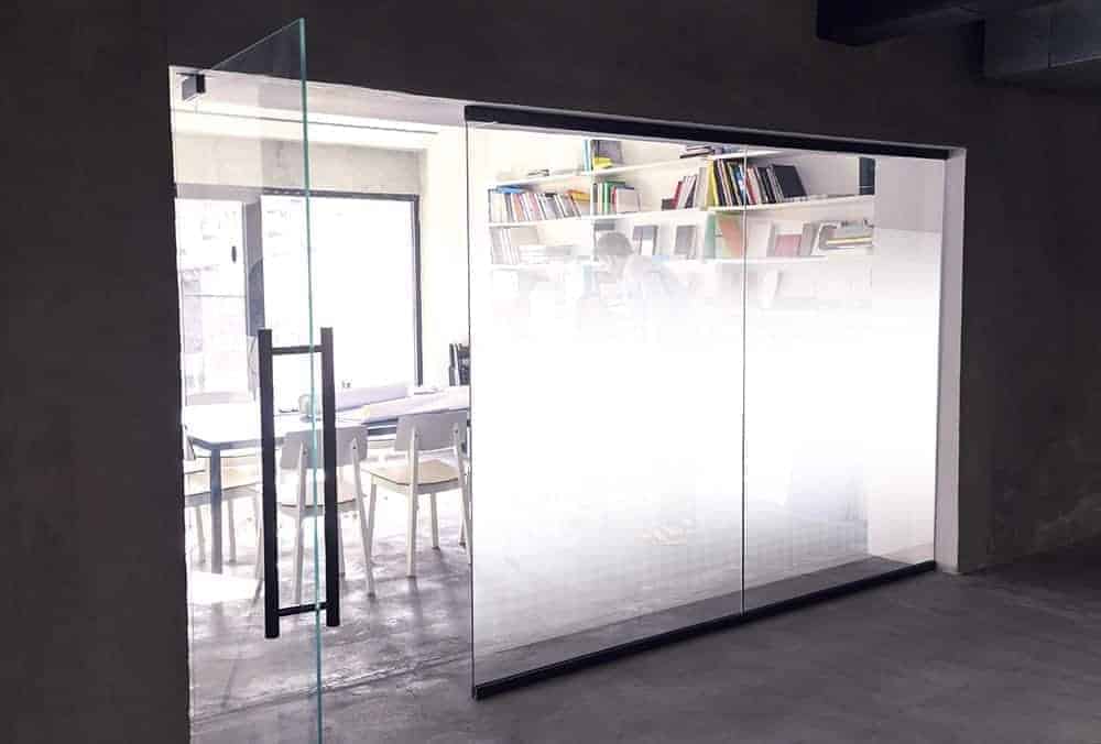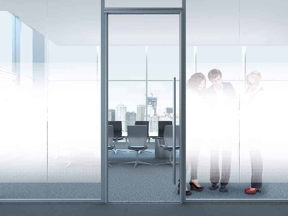 SXJ-0581 Symmetric Fine Dots Gradient. Gradation is from solid translucent white matte to clear in a fine dot formation; a dual direction fade composed of dots. Opaque in the middle, fading out to clear. Designed for eye-level privacy.