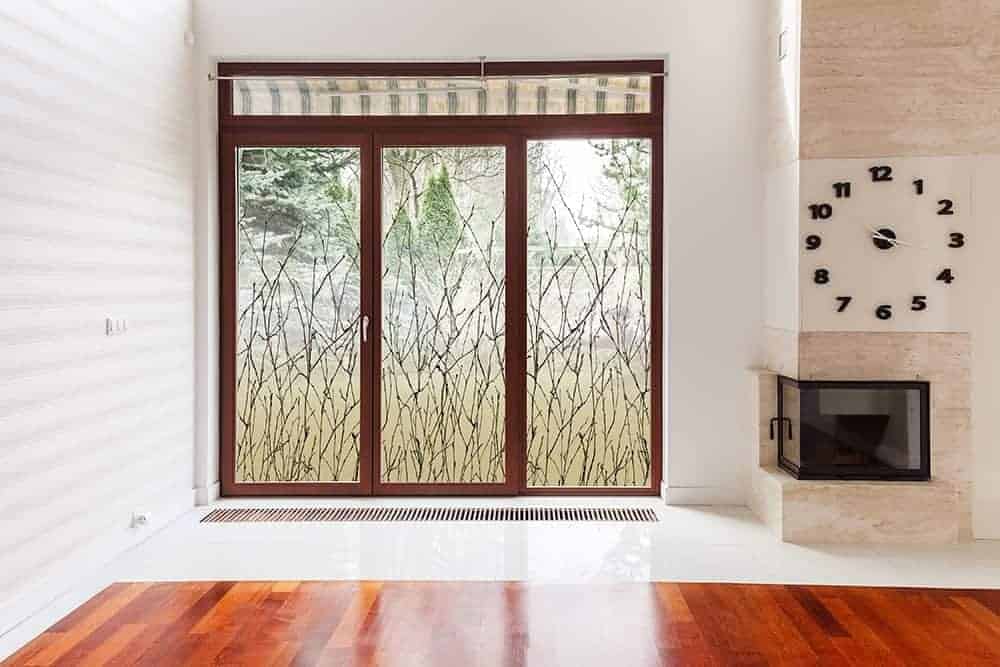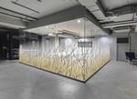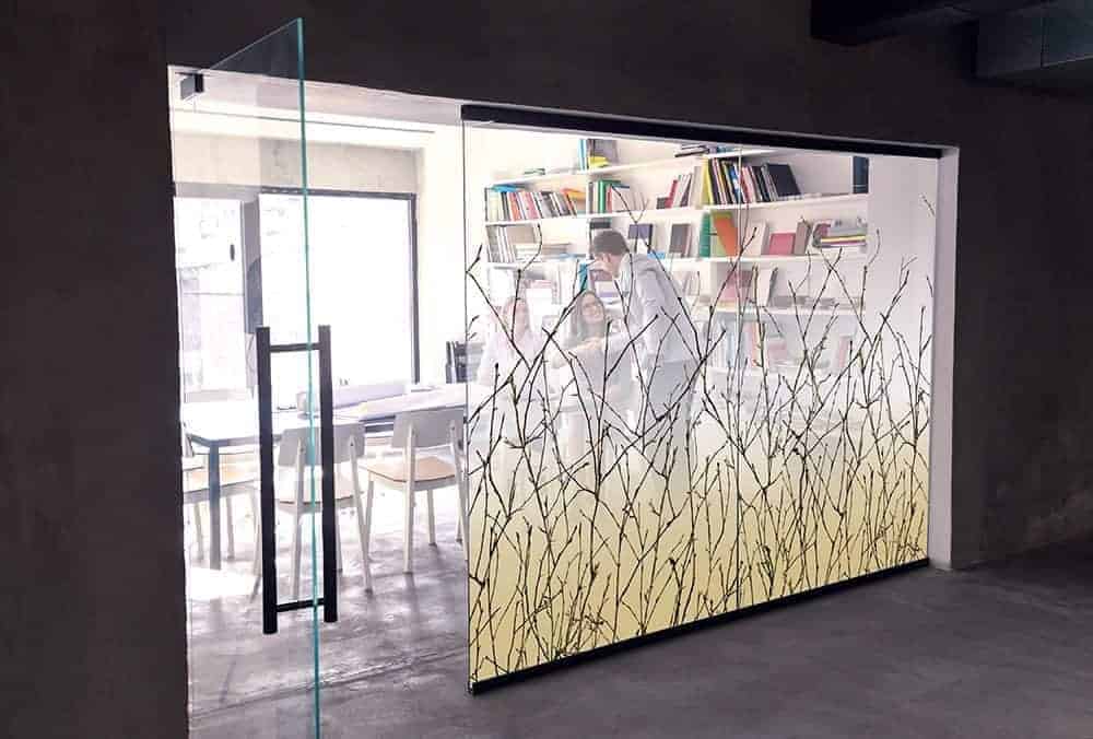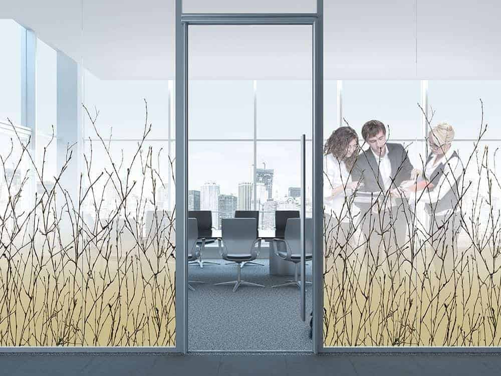Una elegante lámina que proporciona privacidad al tiempo que permite una excelente transmisión de la luz. Silueta de arbustos rodeados de un fondo de color tostado que pasa a blanco y luego a transparente.