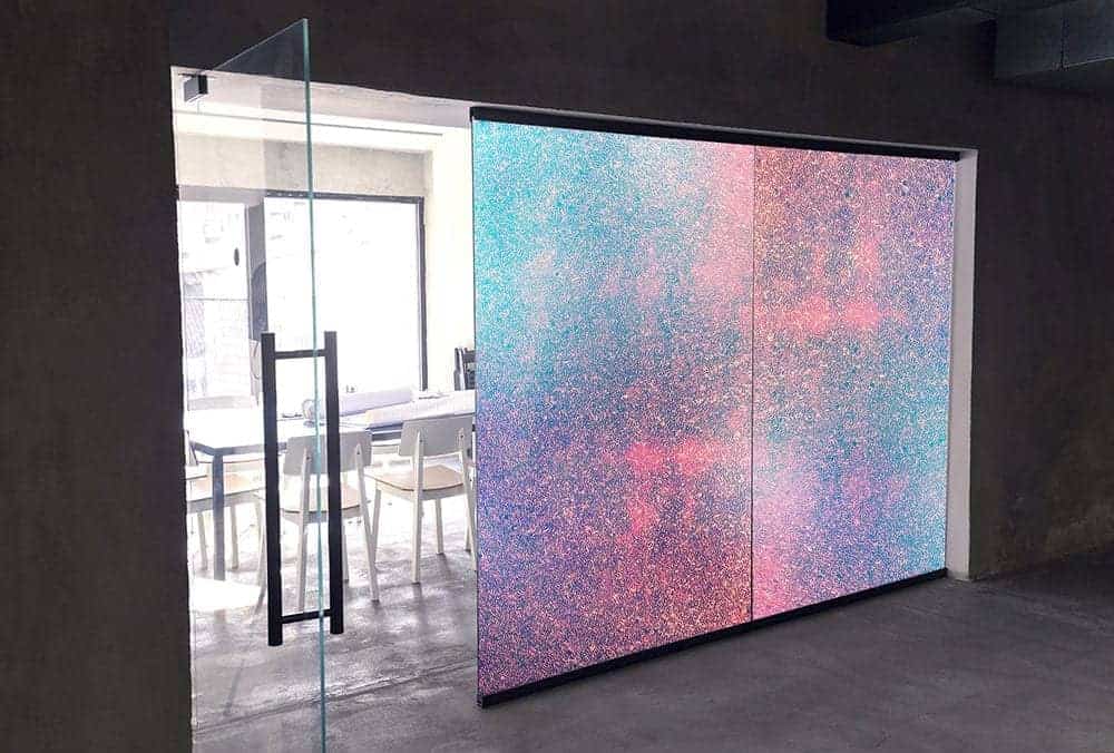 Un film en verre coupé dichroïque, chatoyant et magnifique, qui passe d'un arc-en-ciel de couleurs à un changement de lumière ou de mouvement. Un excellent film d'intimité qui masque la visibilité directe et permet une excellente transmission de la lumière. Adhésif.