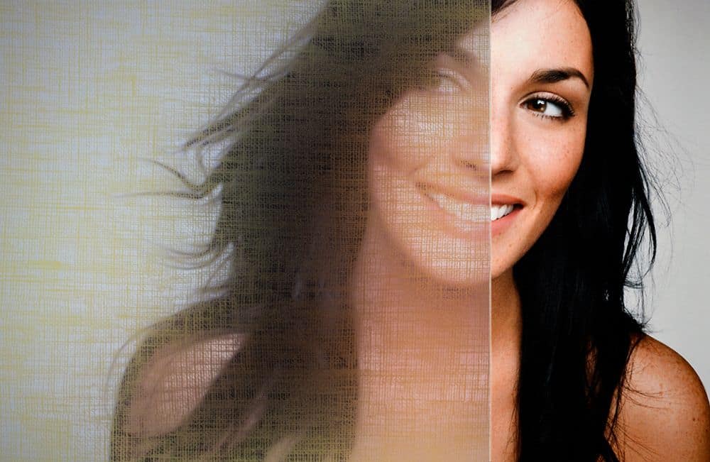 SX-3177 Saffron Organic Cotton se compose de fines lignes verticales et horizontales simulant une matière en coton tissé. L'espace entre les lignes colorées est légèrement givré, ce qui est idéal pour masquer la visibilité tout en permettant une bonne transmission de la lumière.