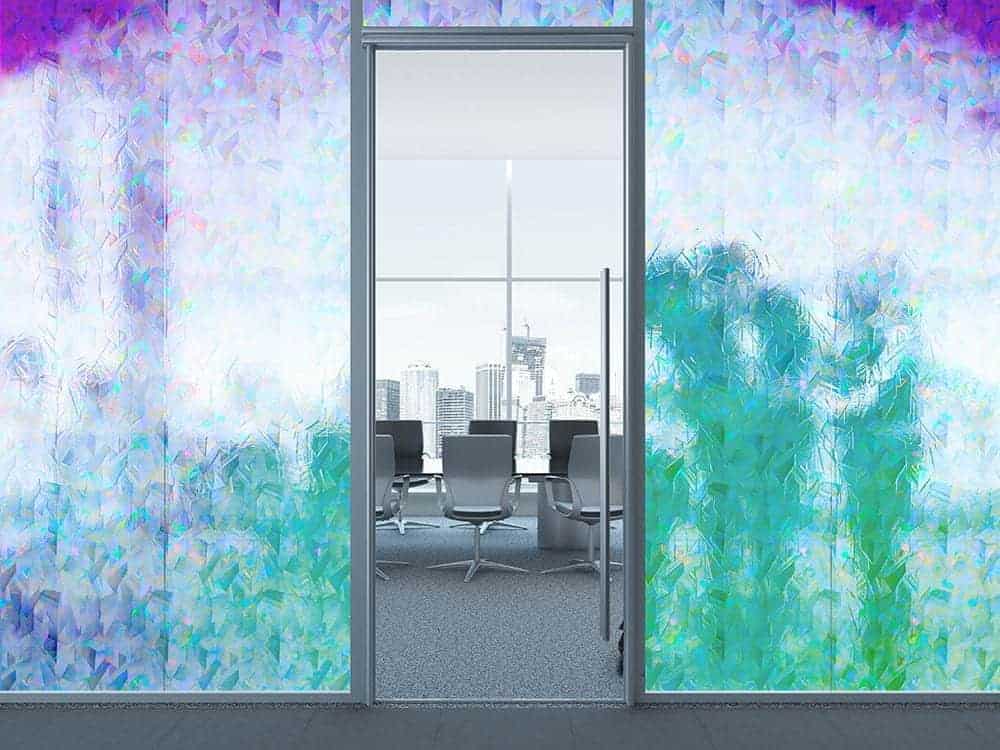 A shimmering and beautiful, dichroic cut glass film that shifts through a rainbow of colours from a change in light or movement. An excellent privacy film obscuring direct visibility and allowing excellent light transmission. Adhesive backed.