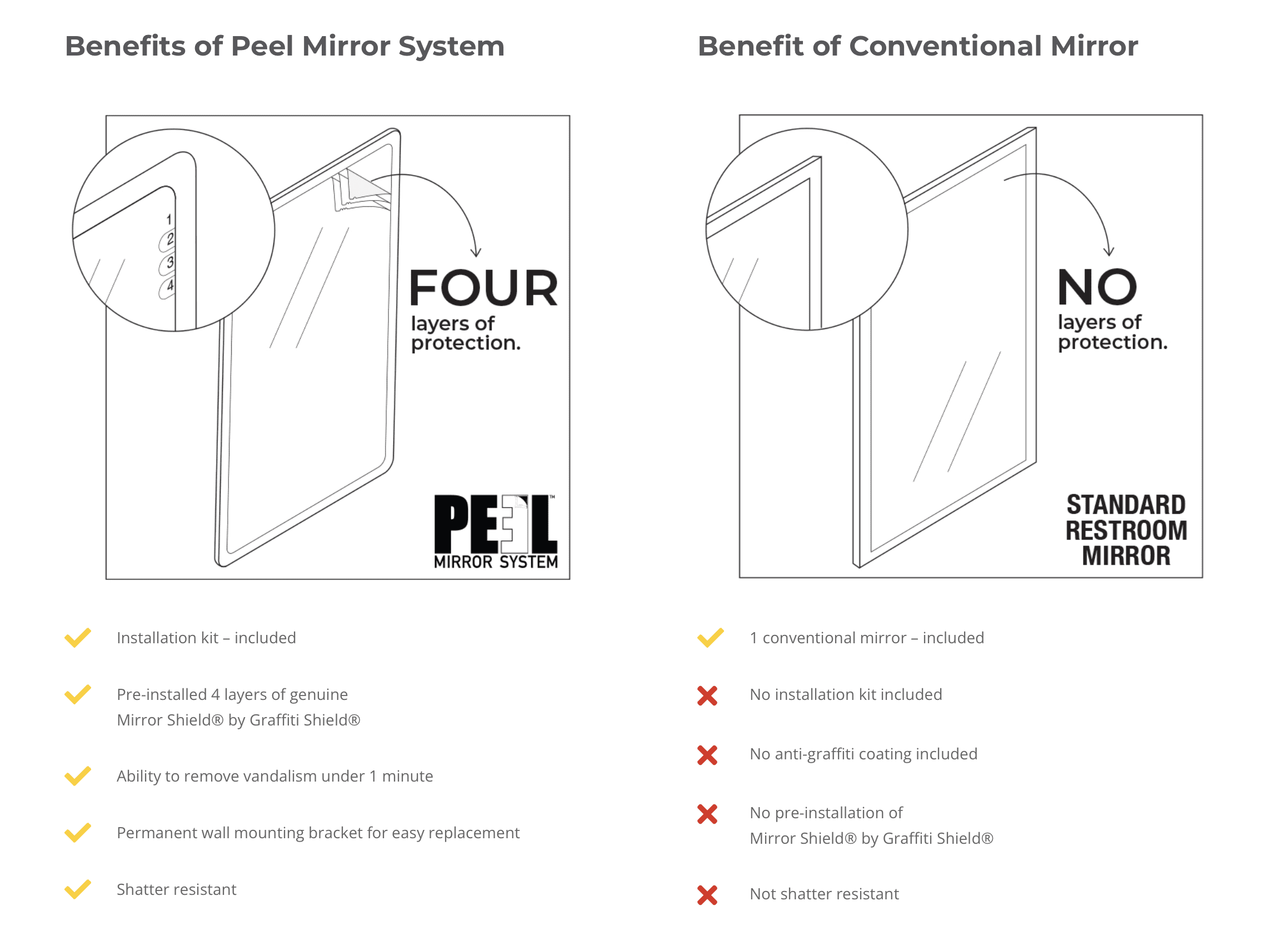 This anti-graffiti replacement kit system ensure mirrors can be used while allowing damaged mirror layers to be removed.