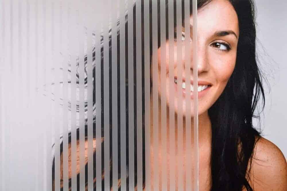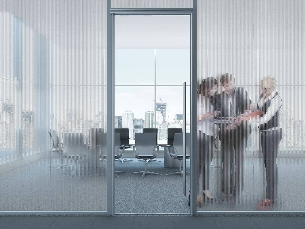 SXC-1418. Frosted 1/4″ wide stripes separated by 1/8″ wide clear lines. Ideal for conference rooms or for office semi privacy. Striped run down the length of the roll as shown.