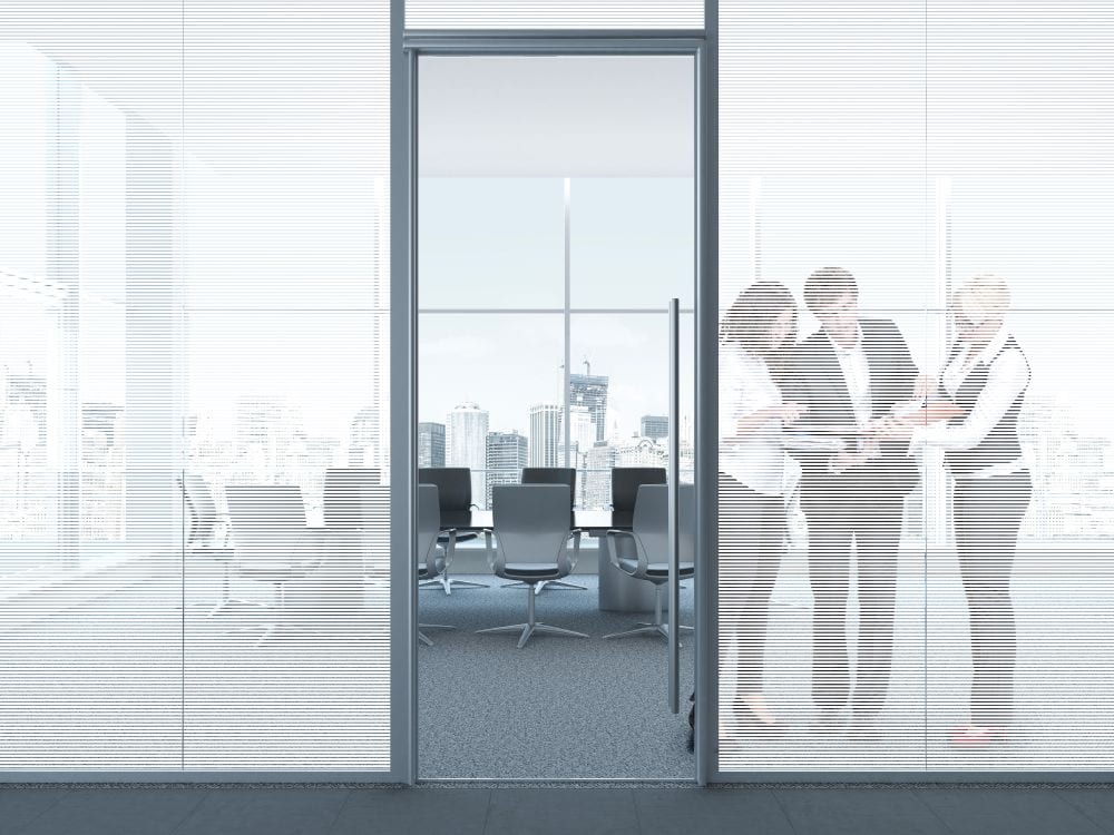 SXC-1419 White Frosted Stripes – 1/4″ stripe, 1/8″ clear. Ideal for conference rooms or for office semi-privacy. Stripes run across the width of the roll as shown.
